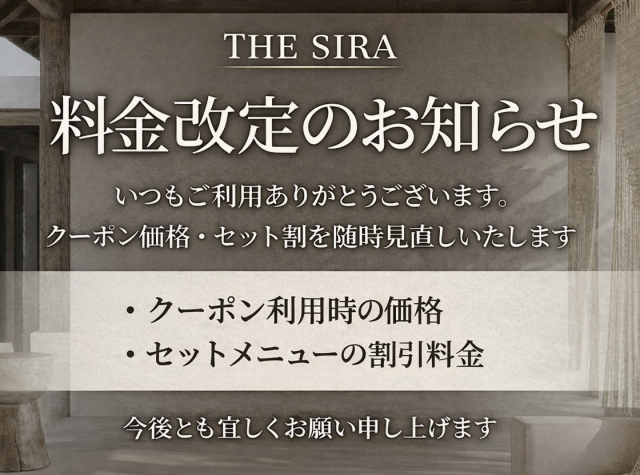 いつもTHE SIRAをご利用いただき誠にありがとうございます。 このたび、原材料費や運営コストの高騰に伴い、誠に勝手ながらクーポン価格を順次改定させて頂いております。 今後も技術・サービスの質を維持し、よりご満足いただ […]