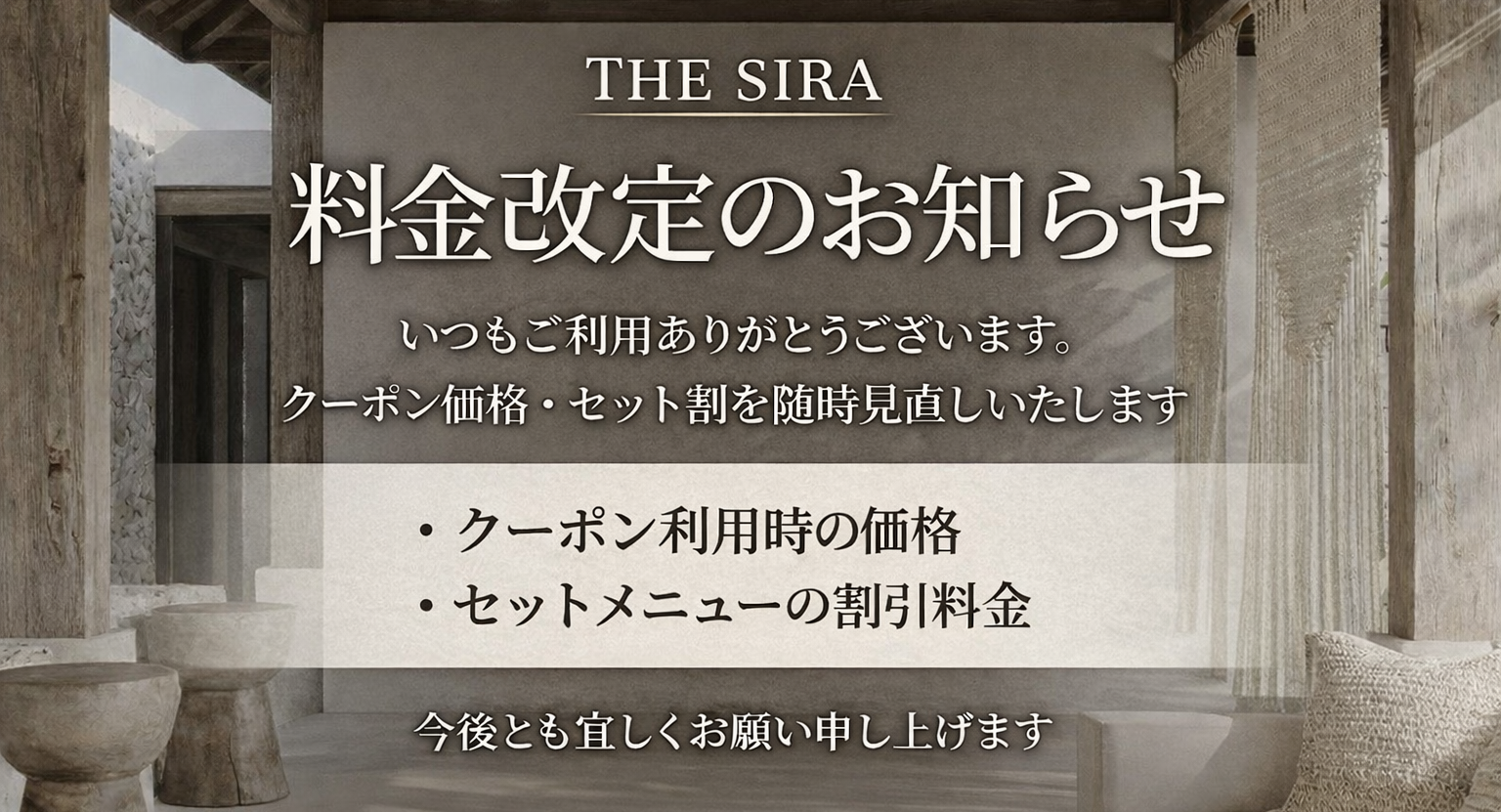 クーポン価格・セット割の料金改定のお知らせ お知らせ キャンペーン・クーポン情報 2026年1月12日 月曜日 いつもTHE SIRAをご利用いただき誠にありがとうございます。 このたび、原材料費や運営コストの高騰に伴い、誠に勝手ながらクーポン価格を順次改定させて頂いております。 今後も技術・サービスの質を維持し、よりご満足いただける施術をご提供できるよう努めてまいります。